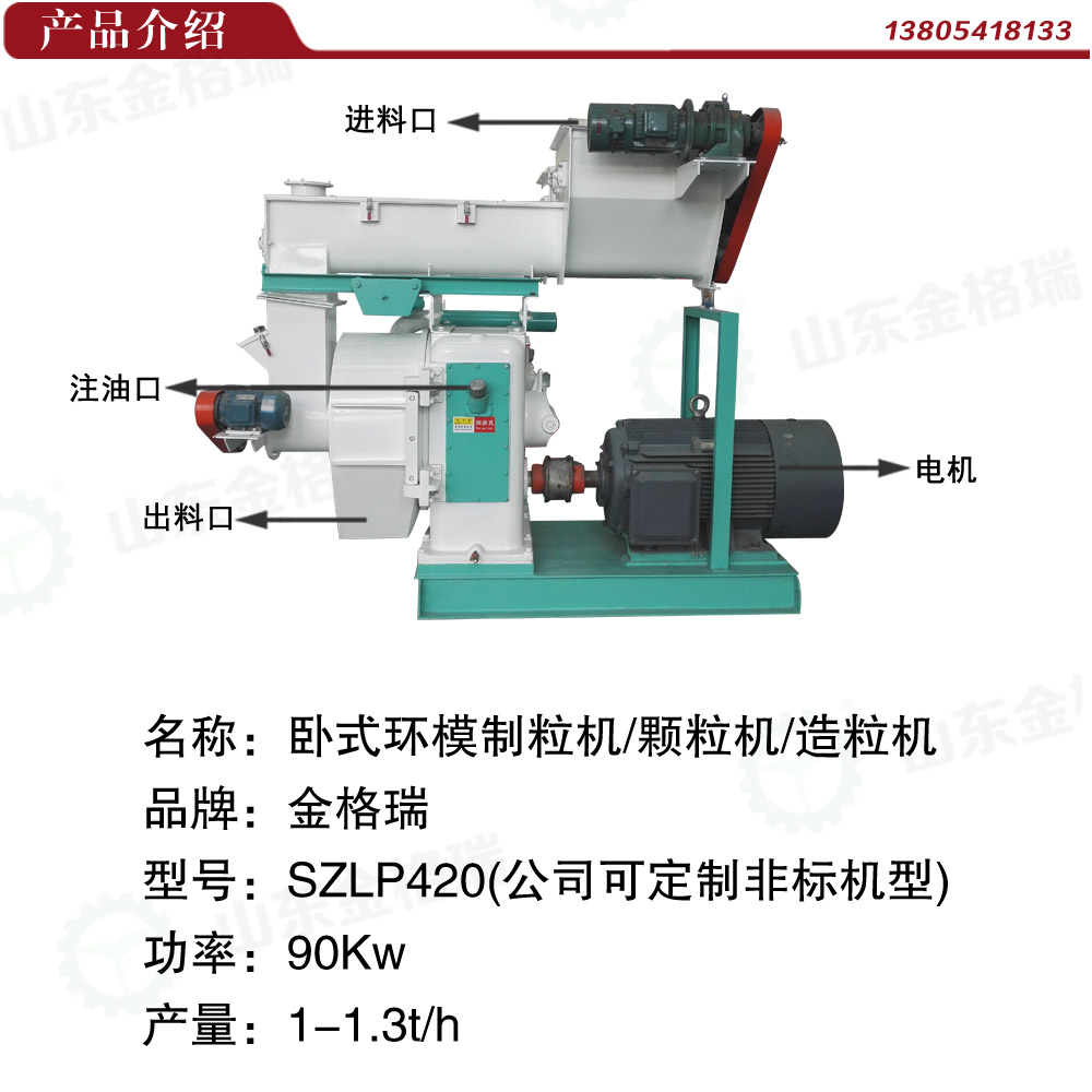 420臥(wo)式(shi)環(huan)模(mo)顆(ke)粒(li)機(ji)是(shi)金(jin)格(ge)瑞(rui)顆(ke)粒(li)機(ji)生(sheng)產(chan)的(de)一(yi)款(kuan)新(xin)型(xing)生(sheng)物(wu)質(zhi)飼(si)料(liao)顆(ke)粒(li)機(ji),高(gao)精(jing)度(du)齒(chi)輪(lun)轉(zhuan)動(dong),本(ben)機(ji)特(te)點(dian)是(shi)節(jie)能(neng)高(gao)產(chan),可(ke)加(jia)工(gong)各(ge)種(zhong)生(sheng)物(wu)質(zhi)和(he)飼(si)料(liao)原(yuan)料(liao),例(li)如(ru)牧(mu)草(cao)、農作物秸稈、玉米、豆柏等。
